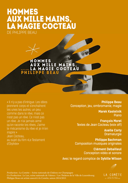 Avec cette nouvelle création, c’est à Cocteau qu’il a choisi de rendre hommage, en concevant un spectacle où l’ombre dialogue avec la lumière, le vrai avec le faux, le passé avec le futur… En inventant une forme où sa dextérité inouïe se met au service de la grâce. Tours de magie, ombromanie, projection d’images féeriques et d’extraits des films de Cocteau, mais aussi merveilleux, surnaturel et âme d’enfant, habiteront le plateau des Hommes aux mille mains, La Magie Cocteau. Pour ce projet qui verra le jour en 2015 et sera présenté pour la première fois à LUX, Scène nationale de Valence, l’illusionniste songe à nous plonger dans un rêve en dix tableaux. Un rêve éveillé, où cohabiteront les mots du poète, un paysage sonore original et autres trésors de l’imagination…